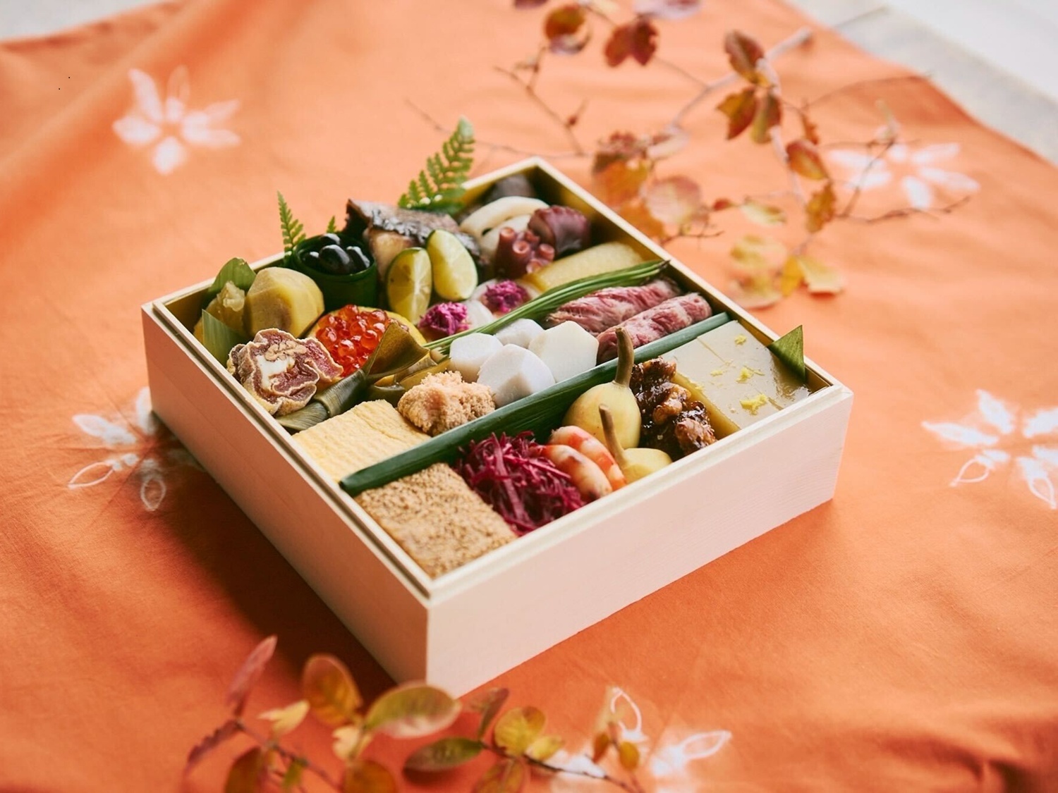能登寒鰤の生姜味噌漬け焼き / 神子原くわいの煮付け / 能登たこのやわらか煮 / 能登の里芋の白煮 / 真子の煮付け / ごぼうとビーツのきんぴら / 段戸高原牛のローストビーフ / だし巻き卵 / 栗きんとん / 黒豆蜜煮 / 松風焼き / 蕪とサーモン / いくら柚子釜 / 数の子 / 車海老うま煮 / 蜂屋柿のピーカンナッツクリームチーズ巻き / 蓮根と椎茸煮物 / 無花果と胡桃の甘露煮 / 柚子と南高梅の羊羹