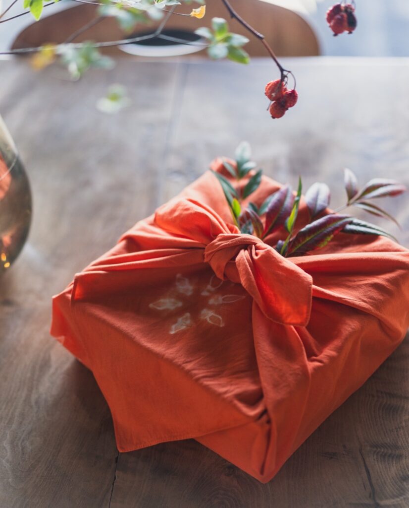 鮮やかな橙色の風呂敷には、2026年春夏コレクション「BRIDGE」のモチーフの一つとなる胡蝶絞りが施され、伝統的な手仕事を感じる一枚。