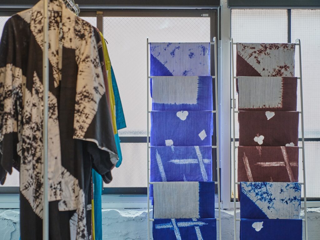 ここへ、2026年にsuzusan秋冬テーマであるFABLEに登場した、羽が舞う幻想的なパターンを巻縫い絞りという技法で表現した「舞羽根」を追加。色展開に関しては、当初の3色にくわえ、有松らしいオーセンティックな紺、ユニセックスに着られる焦茶、パッと目を惹く朝顔の3色を加えた全6色でのご案内となります。